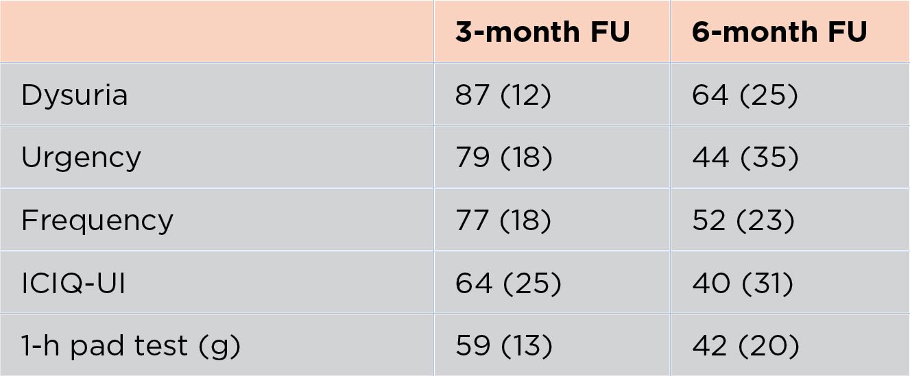 29 female patients, aged between 56 and 77 years, with diagnosed GSM, having less than 5% of vaginal superficial cells in the cytology, vaginal pH higher than 5, with urinary symptoms of GSM (dysuria, frequency, urgency) and impaired continence due to urethral atrophy, received two sessions of the intraurethral non-ablative Erbium SMOOTH™ mode laser therapy, with a 3-week interval in-between the sessions. The therapeutic efficacy was determined using ICIQ-SF, the 1-hour pad test and VAS scores. Follow ups (FU) were at 3 and 6 months.